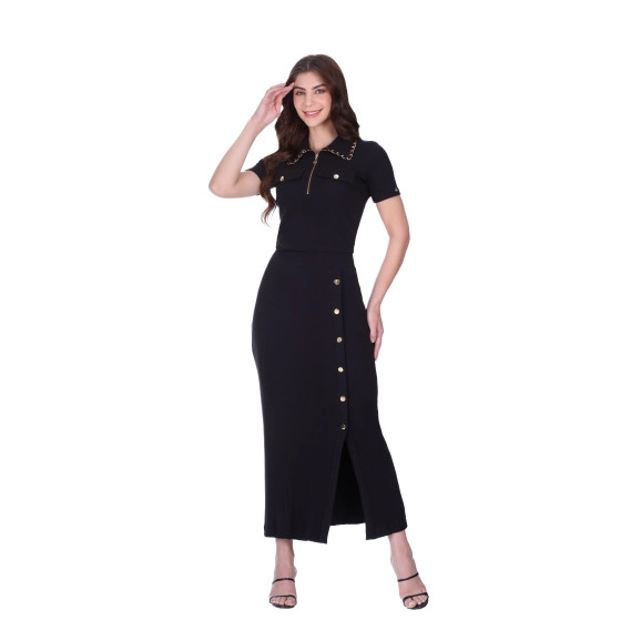 Conjunto confeccionado em malha canelada. Blusa com decote com gola, zíper funcional, detalhe de bordado manual em corrente, lapelas com botões fixos e mangas curtas. Saia com elástico interno no cós, revel frontal com botões fixos, fenda frontal e possui forro.