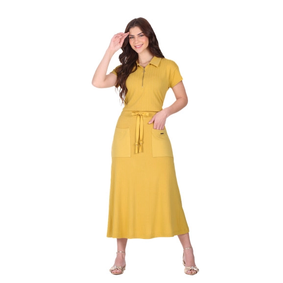 Conjunto confeccionado em malha com aspecto de tricô e ribana. Blusa em malha com aspecto de tricô, decote com gola em ribana, zíper frontal funcional, cavas deslocadas e mangas curtas. Saia em malha com aspecto de tricô, cós em ribana com elástico interno e galão fixo com ponteiras, bolsos funcionais em ribana e possui forro.