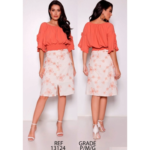 Detalhe: blusa ciganinha com babado nas mangas. Saia possui bolsos laterais, detalhe em botões frontais. Look super despojado, ideal para você curtir o final de semana com a família, ir no shopping..