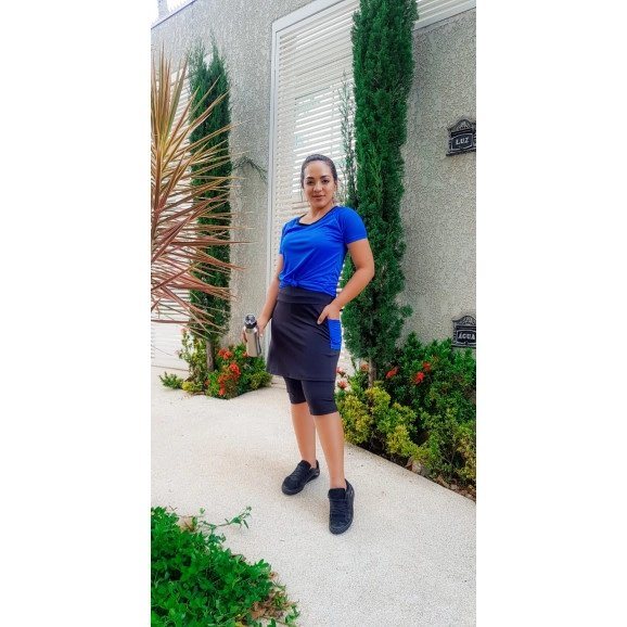 Conjunto Saia com Shorts Azul Moda Fitness, blusa lisa, saia com elástico na cintura, possui bolsos laterais, confeccionado em 90% Poliamida 10% Elastano. Obs. Não possui detalhe preto na blusa.
