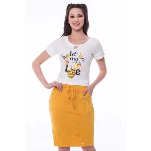 Detalhe: blusa confeccionada em malha, saia em lese com elástico e detalhe em cordão na cintura, bolsos laterais. Conjunto super charmoso, fica lindo com tênis!