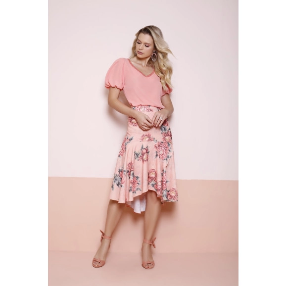 Detalhe: a blusa possui detalhe bordado na gola e nas mangas,saia mullet com fechamento em zíper lateral. Tem look mais charmoso que esse? Adquira já o seu, você não vai se arrepender!