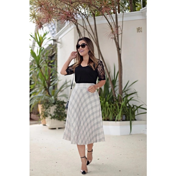 Detalhe: blusa confeccionada em malha com detalhes em renda, saia plissada com fechamento em zíper lateral. Look moderno, feminino, pode ser usado durante o dia ou a noite.