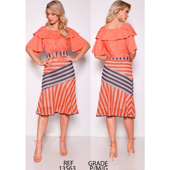 Detalhe: Blusa possui babado, detalhe em guiper nas mangas, fechamento em botões, detalhe em amarração. Saia confeccionada em tricot com fechamento em zíper lateral. Look super despojado, sem falar no conforto! Ideal usar em eventos mais descontraído!