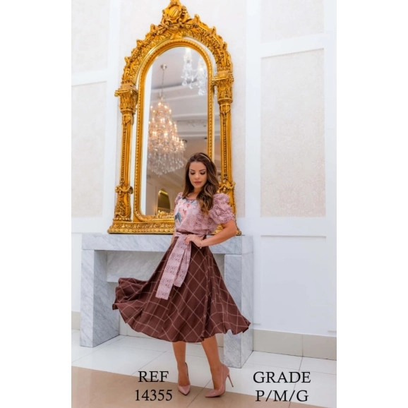 A blusa do Conjunto Saia Xadrez Fasciniu's foi confeccionada em chiffon com bordado em pedrarias na gola, babado nas mangas, a saia possui modelagem godê confeccionada em crepe e fechamento em zíper atrás, faixa embutida. A composição da blusa é de 100% Poliester, saia 97% Poliester 3% Elastano e forro 100% Poliester. Look elegante, super feminino, ideal para ir ao culto!
