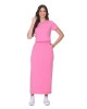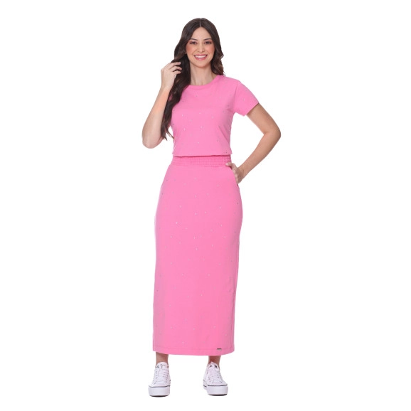Conjunto confeccionado em malha de algodão sustentável,ribana e moletom. Blusa com decote redondo em ribana,mangas curtas e detalhe em termocolante. Saia com cóslargo e elástico interno, bolsos frontais funcionais, bolsostraseiros falsos, detalhe em termo colante, fenda traseira epossui forro.