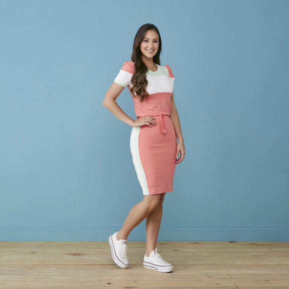 Conjunto Tricolor Laranja Tatá Martello, confeccionado na malha viscolycra, blusa manga curta com decote arredondado, possui recortes tricolor, saia forrada, elástico na cintura, detalhe de amarração com ponteiras, faixa lateral com recortes. Composição:96% Viscose 4% Elastano