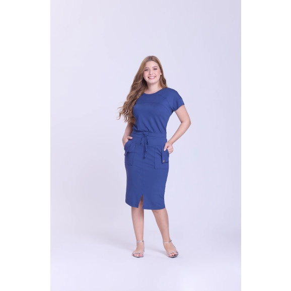 Conjunto em moletinho, decote redondo, mangas deslocadas, elástico interno no cós, viés e ponteiras. Saia com elástico interno cós, bolsos funcionais e botões de metais fixo, fenda frontal e possui forro.