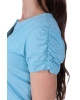 abertura em V, mangas curtas com detalhe franzido