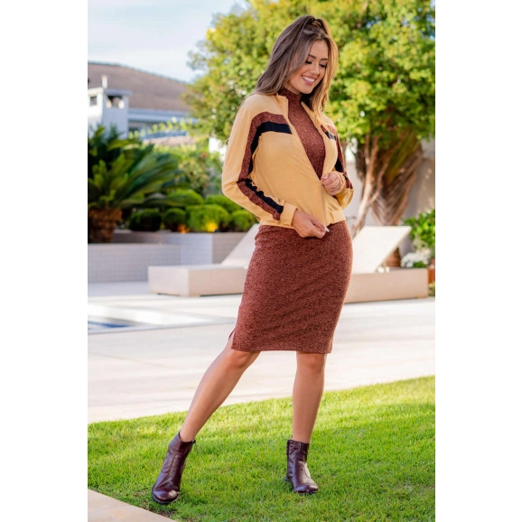 Jaqueta bomber de malha canelada com detalhes em marrom e preto.