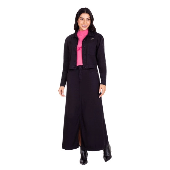 Jaqueta confeccionada jeans color, fechamento frontal por botões flexíveis encapados, bolso falso e outro funcional e mangas com punho e botões funcionais.