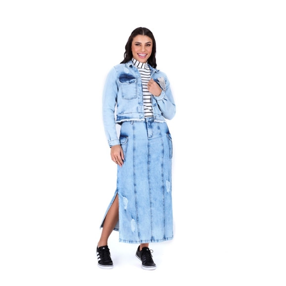 Jaqueta confeccionada em jeans, fechamento frontal por botões de pressão encapados, bolsos funcionais e acompanha broche em strass.