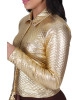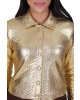Jaqueta confeccionada em tecido metalizado metelasse, fechamento frontal por botão de pressão encapado.