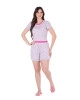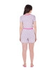 Pijama confeccionado em malha. Blusa com decote em ribana e mangas curtas. Shorts com elástico interno no cós de ribana, bolsos funcionais e acompanha saquinho.