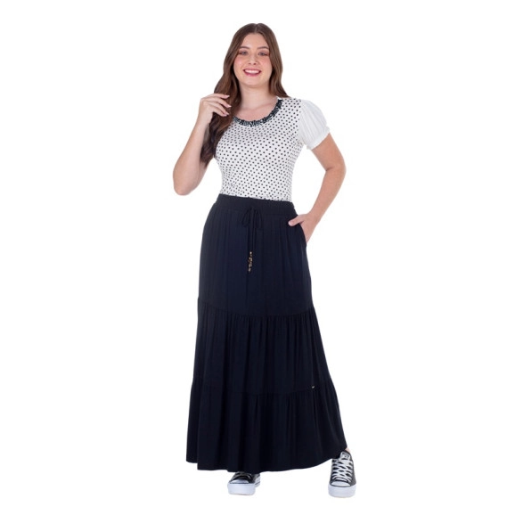 Saia confeccionada em malha, elástico interno no cós, bolsos funcionais e possui forro.Composição: 96% viscose 4% elastano forro 100% poliester.