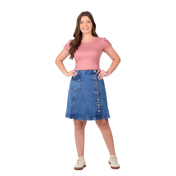Saia confeccionada em jeans, cós tradicional com passantes, fechamento frontal por botões flexíveis e bolso funcional lateral