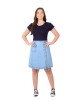 Saia confeccionada em jeans, cós tradicional com passantes, fechamento frontal por botões flexíveis e bolso funcional lateral