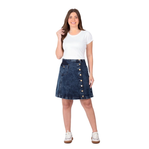 Saia confeccionada em jeans, cós tradicional com passantes, fechamento frontal por botões flexíveis e bolso funcional lateral