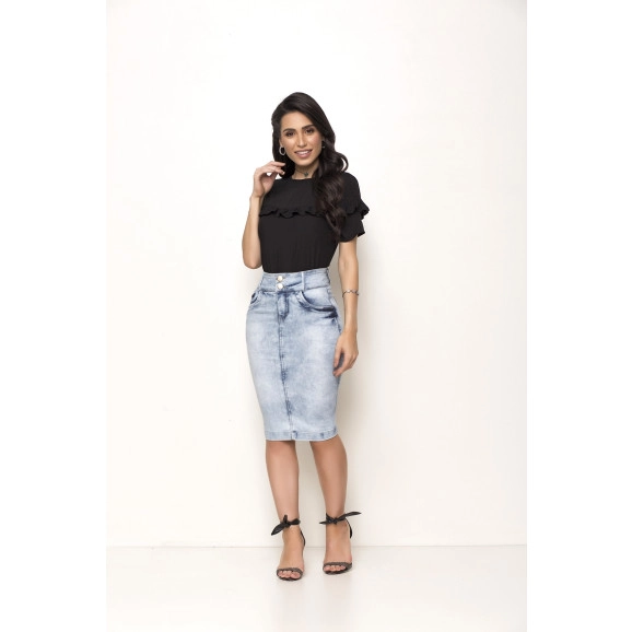 Detalhe: Saia tradicional basic jeans possui bolsos laterais e atrás. Peça atemporal, as saias podem ser usadas em diversas ocasiões, seja com tênis ou salto. De Fácil combinação.