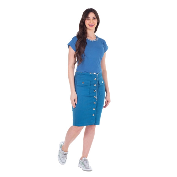 Saia confeccionada em jeans color, fechamento frontal por botões, cós com ilhós e corrente e bolsos funcionais.