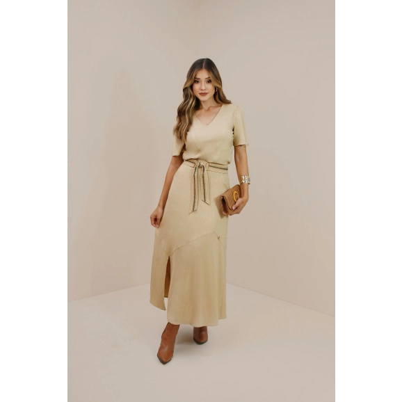 Saia Camelia Em Midi Com Recorte Assimétrico Bege Plus Size Nitido