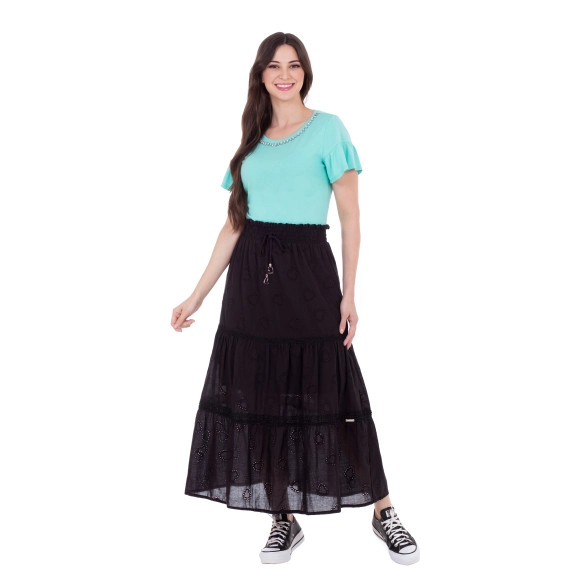 Saia confeccionada em tecido plano laise, cós com elástico interno e viés fixo, detalhe em guipir e possui forro. Composição: 100% algodão forro 100% poliester