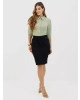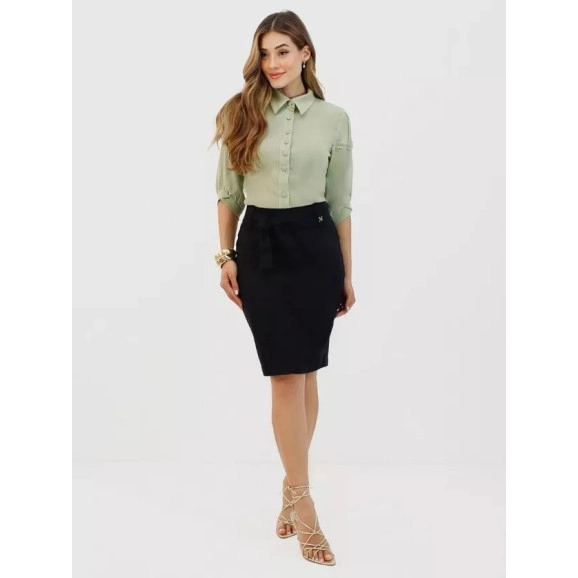 saia preta jeans com fechamento traseiro com zíper, e faixa para amarração.