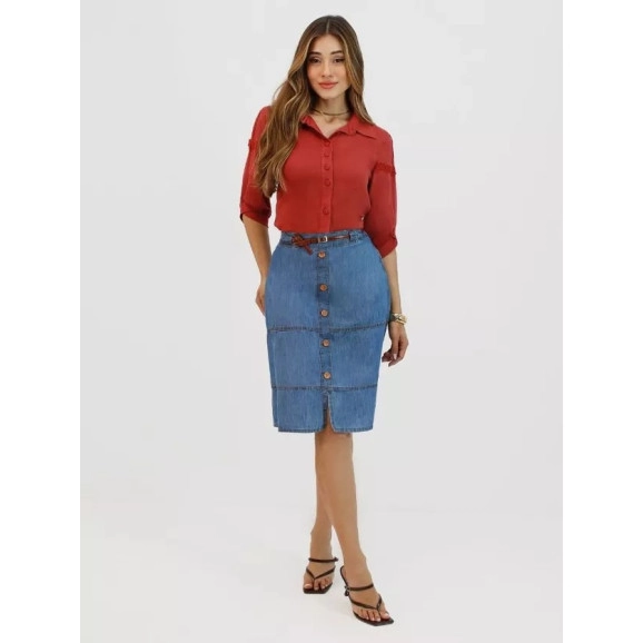 saia jeans no tecido mavie, shape evasê com vista falsa frontal, recortes no comprimento e fenda frontal. Possui passante horizontal e cinto de couro. Fechamento em zíper lateral.