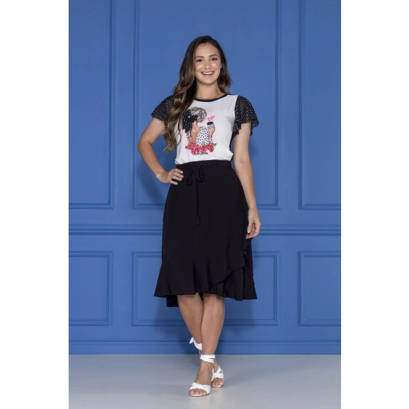 Saia Tatá Martello confeccionada em viscolinho, detalhe de amarrração lateral, forrada, com babados.