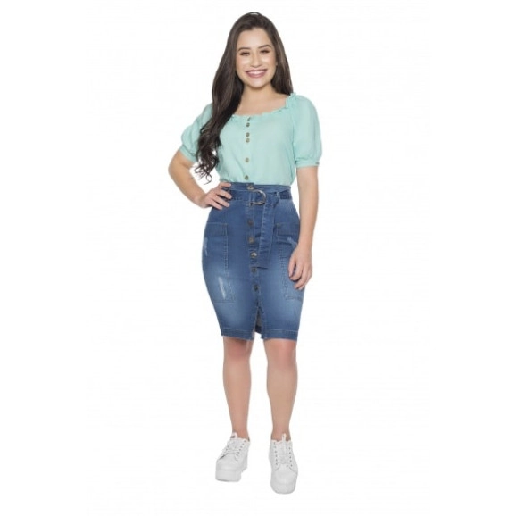 Detalhe: saia jeans com botões na frente, possui bolsos. Saia super moderna, despojada, além de ser super versátil, pode ser usada com salto ou tênis!