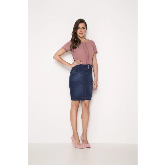 Saia Confort Jeans Laura Rosa , possui fechamento em botões, bolsos funcionais na parte da frente e atrás. Fica linda com qualquer blusinha!