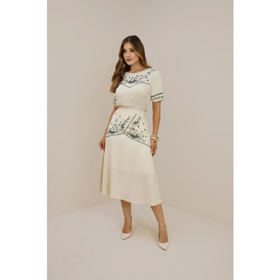 Saia midi evasê em viscose com elastano, com recorte arredondado no quadril, bordado barroco e acabamento em rendinha.
