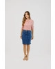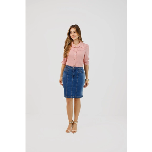 Saia jeans no tecido first denim com recorte na linha princesa e detalhe de bordado entre a linha e o bolso. Possui fechamento em botão e vista J com bolso frontal e traseiro.