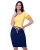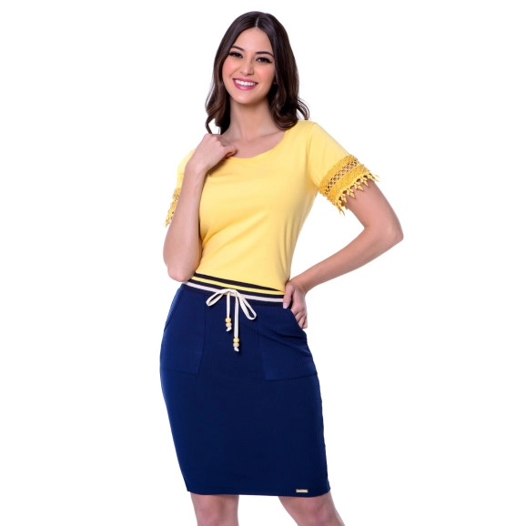 Saia de malha canelada com cós de ribana listradinha, roletê de algodão e ponteiras redondinhas.Composição:93% viscose- 7% elastano