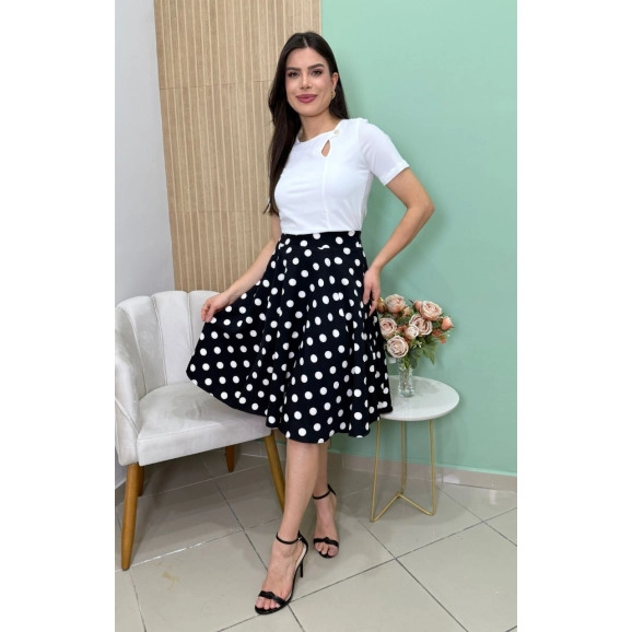 Saia Deise Em Afaiataria Poá Preta Maria Amore