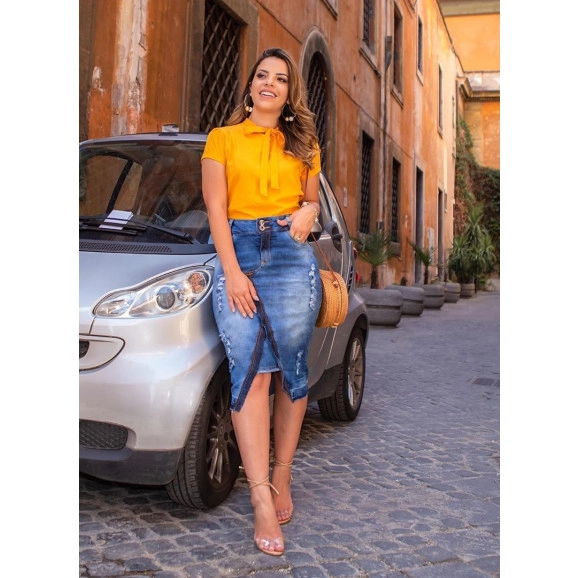 Detalhe: saia jeans destroyed, possui recorte diferenciado, bolsos laterais e atrás. Saia super despojada para você montar vários looks!