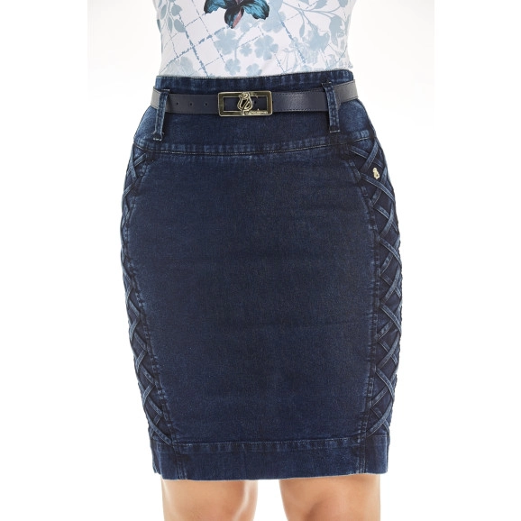 Detalhe: Saia jeans possui detalhe cruzado na lateral, bolsos e fechamento em zíper atrás.Peça chave no guarda-roupa feminino, a saia jeans pode criar looks dos mais básicos aos mais formais!