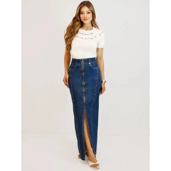 Saia jeans no tecido mosqueiro no comprimento longo, possui fechamento em zíper de metal na parte frontal da peça, recorte diferenciado e bolso frontal e traseiro.