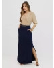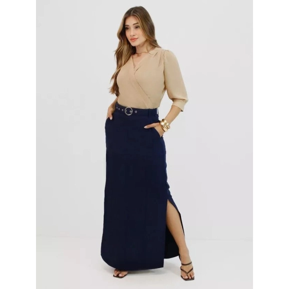 Saia longa na alfaiataria com recorte no quadril e linha princesa, possui fendas nas laterais e fechamento em zíper na lateral. Acompanha cinto.