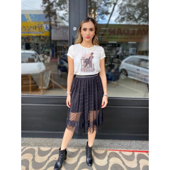 Saia em Tule Poá Preta Victoria's Princess, confeccionado em tule com poá, possui detalhe em renda na barra elástico na cintura. Composição do Tecido tule 100% Poliamida, renda 100%Poliester Forro:96%poliester 4%elastano. Peça moderna, ideal para compor aquele look mais elaborado, perfeita para eventos mais chiques!