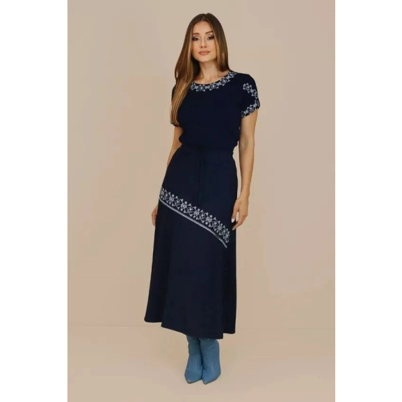 Saia midi com recorte assimétrico, babado evasê e bordado, trazendo movimento e elegância.