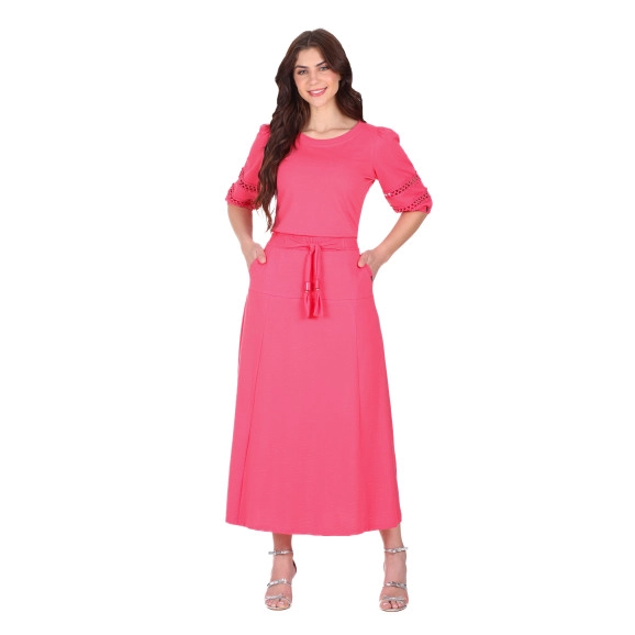 Saia confeccionada em malha texturizada, cós com elástico interno e detalhe em faixa com ponteiras, bolsos funcionais e possui forro.