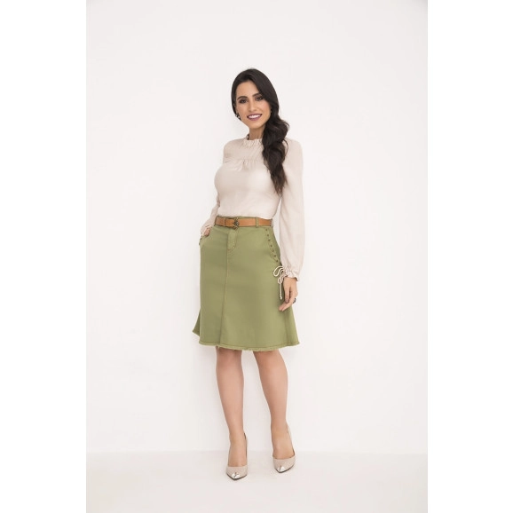 Saia Evasê Verde Laura Rosa , modelagem evasê, barra desfiada, detalhe em rebite, possui bolsos laterais e atrás. Composição do Tecido 98%algodão 2%Elastano. Saia linda, despojada e a cara da estação! Fica linda com blusas lisas!Obs: O tom do verde pode alterar! Não acompanha cinto!