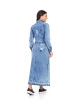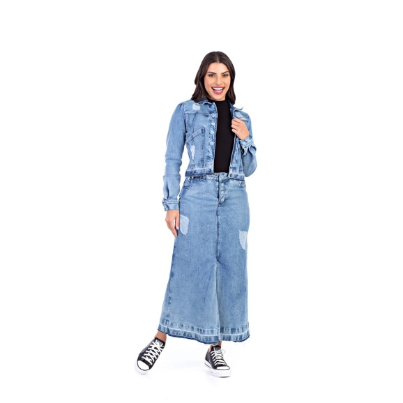 Saia confeccionada em jeans, fechamento frontal por botões de pressão encapados, shape levemente em A, fenda frontal, comprimento novo longo, bolsos frontais e traseiros funcionais, detalhe em barra desfeita e levemente desfiada. Composição saia 99% algodão 1% elastano | forro bolso 80% algodão 20% poliester.