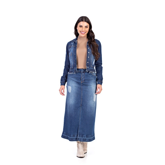 Saia confeccionada em jeans, fechamento frontal por botões de pressão encapados, shape levemente em A, fenda frontal, comprimento novo longo, bolsos frontais e traseiros funcionais, detalhe em barra desfeita e levemente desfiada. Composição saia 99% algodão 1% elastano | forro bolso 80% algodão 20% poliester.