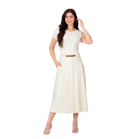 Saia confeccionada em malha viscose mesclada com linho, cós largo com elástico interno nas costas e com recorte e mini cinto na frente, revel frontal com botões fixos, bolsos funcionais e possui forro