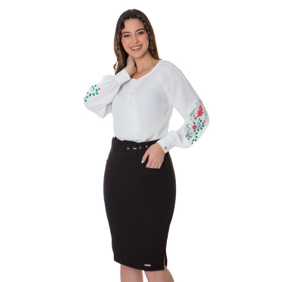 Saia em tecido plano, shape justo com fendas nas laterais, fechamento por zíper traseiro, bolsos frontais funcionais, acompanha cinto encapado do mesmo tecido. Possui forro. Composição 96% poliéster 4% elastano