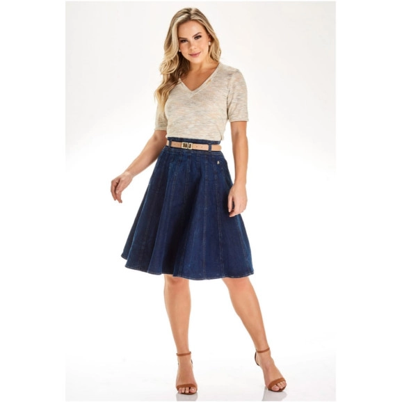 Detalhe: saia jeans godê com fechamento em zíper lateral. Saia mara, super despojada para você criar vários looks!