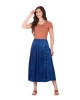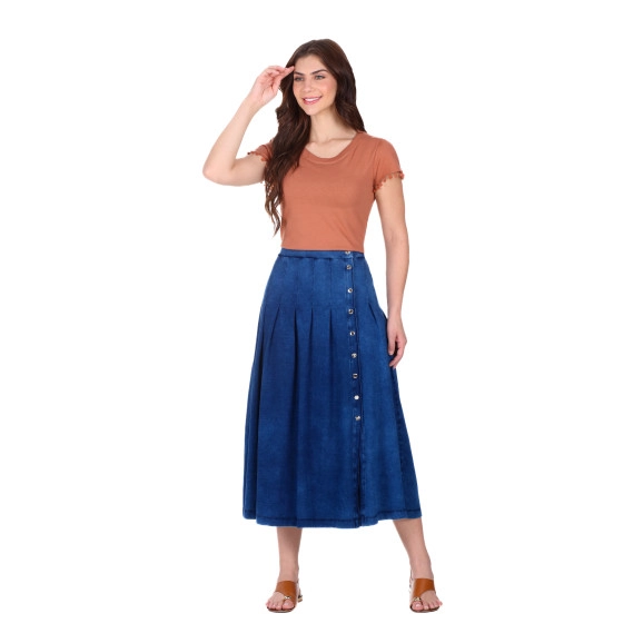 Saia confeccionada em malha jeans, cós com elástico interno traseiro, vista frontal com botões de pressão funcionais e detalhe em pregas