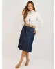 Saia no tecido jeans benicio, possui comprimento midi, com bolso cargo na parte frontal. Recorte na linha princesa e cós de revel. Fenda frontal e fechamento em zíper de metal.